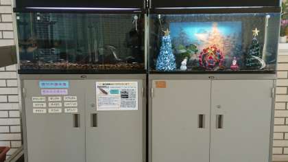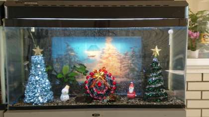 玄関の水槽がクリスマスバージョンに変わりました。とっても綺麗でキラキラしています。