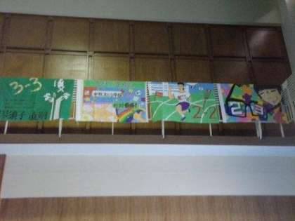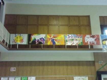 体育大会用に制作した学級旗と生徒会横断幕を展示しました。