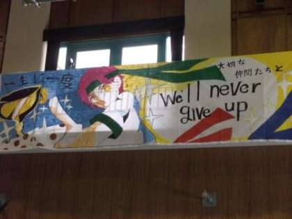 今年度の体育大会のスローガンは『一生に一度大切な仲間たちと We'll never give up!』でした。生徒会のメンバーで一生懸命作りました。この横断幕を見ると、今でも体育大会のあの雰囲気が蘇ってくるようです。
