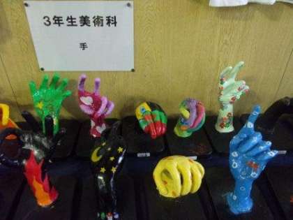 粘土で自分の手をリアルに作り、表面には自由な表現で着彩しました。