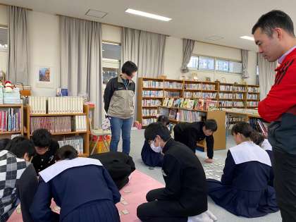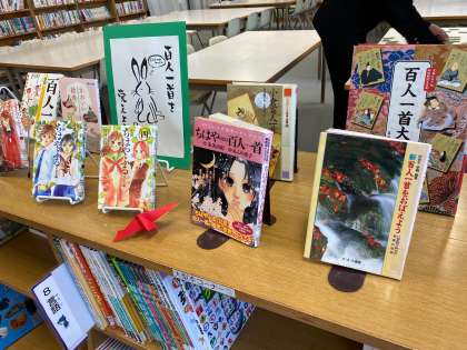 昨日から図書室において、朝の百人一首カルタ取りの練習をしています。3人の担任の先生も微笑みながら見守ったり、本気で勝負してみたり。