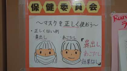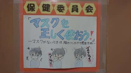 本校は、保健委員会の指導もあり、咳エチケット・手洗いうがい・部屋の換気などを生徒自身が意識して行っているおかげで、今のところ落ち着いた状況です。