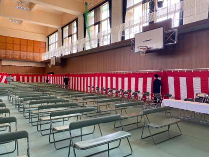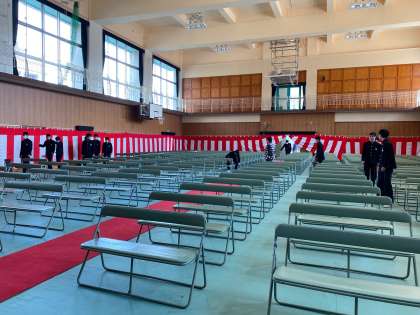 その後、2年生1組の一部生徒で明後日の卒業式の準備をしました。少人数ながらも、自分達で考えて作業を進めるなど、良い動きを見せてくれていました。