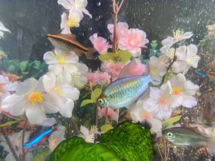 熱帯魚の水槽は季節によってレイアウトが変わり、今は花いっぱいの春の風情です。