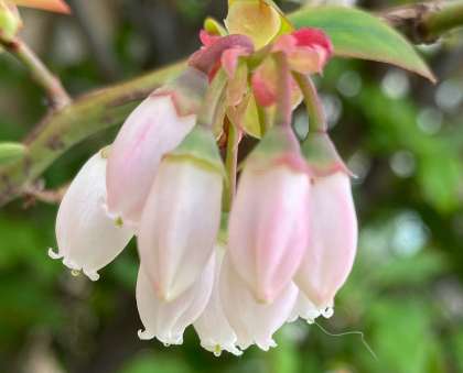 上から、ブルーベリー(ツツジ科)、姫リンゴ(バラ科)、グミ(グミ科)の花です。