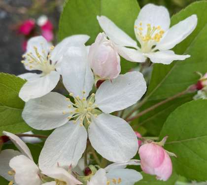姫リンゴは桜や梅と同じ、バラ科。花びらが5枚ありますね。バラも原種に近いものはちゃんと5枚花びらがあります。イチゴや桃も含めて、バラ科の花たちは似たような花を咲かせます。