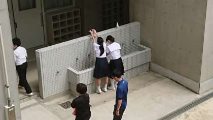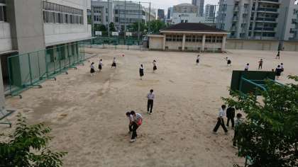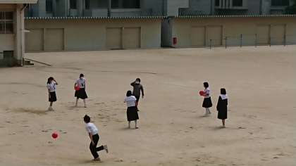 運動場で軽い運動です。先生も一緒にからだを動かして楽しく遊んでます(ダイエット?)。