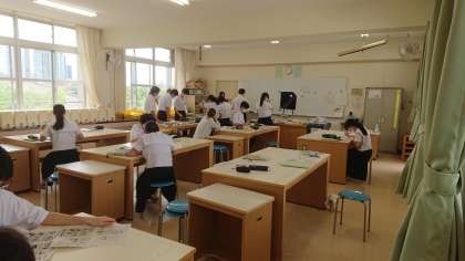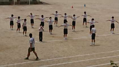写真は、上から3年生(被服室での家庭科)・2年生(運動場での男子体育)・1年生(教室での社会科)の様子です。
