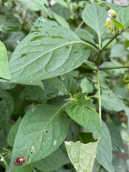 通学路の路傍に咲く、ナス科の野草にたくさんのテントウムシがいます。