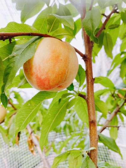 3月に花を咲かせた正門横の桃が結実しています。