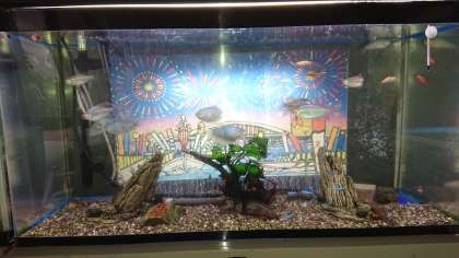 本校、玄関の水槽です。毎夏、最大の地域行事である『天神祭』(毎年、7月24日・25日開催)を気分だけでも味わっていただけたら!