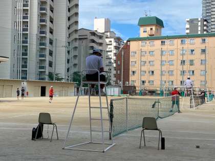 写真は第三者校として審判をしている本校生徒です。際どいところに着地したサービスをナイスジャッジしていました。