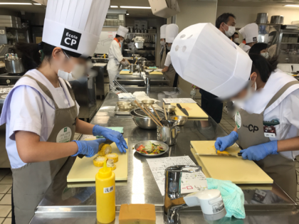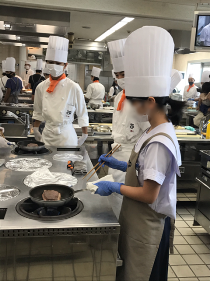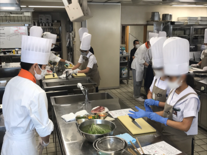 本日、育成調理師専門学校にて、調理実習をさせていただいています。調理メニューは、鴨ロース肉のオリジナルソースがけです。