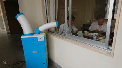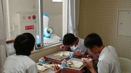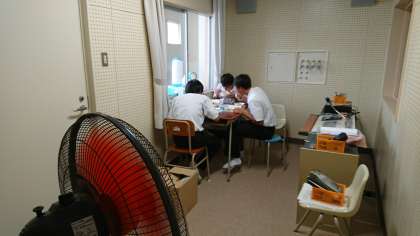 写真は、お昼の音楽放送の様子です。生徒会役員が担当してくれています。放送室にはエアコンもなく(今は、スポットクーラーと扇風機で何とか対応)とても暑い中、昼食を取りながらの放送はたいへんです。「生徒の皆さん、楽しい昼食時間にするために頑張ってくれている生徒会役員の皆さんに感謝しましょう!」「生徒会の皆さん、熱中症にはくれぐれもご注意を!」