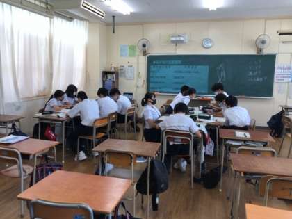 全員マスク着用、机はつけないという約束のもと、グループワークで著作権について考えました。