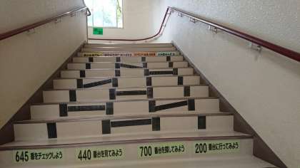 冗談はさておき、学校元気アップのコーディネーター・ボランティアの皆さんが図書館のPRとして作ってくれた階段アート?です。「いつもありがとうございます!」