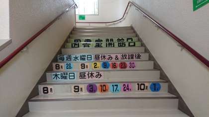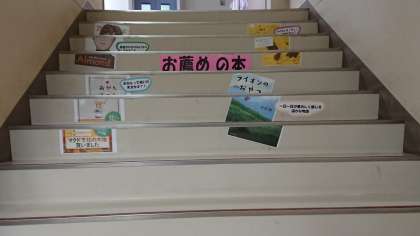 本館の階段に図書室の開館日やお薦めの本の紹介をしてもらっています。