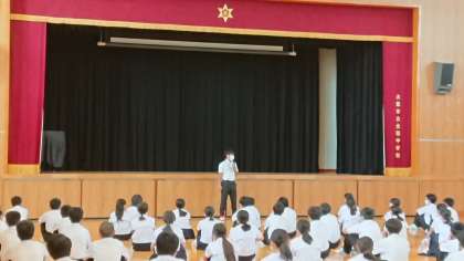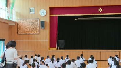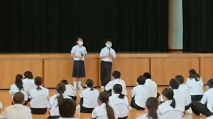 続いて、担当の先生からも昨日の『体育大会』についてのお話がありました。「2・3年生の上級生の姿をみてどうでしたか」「さすが、上級生だと感じたんじゃないですか」「でも、1年生もラジオ体操や行進では、2・3年生に匹敵するくらい十分よく頑張っていました」「君たちが上級生になった時、下級生からすごい・さすがと思われるようになりたいですね」という内容のお話がありました。