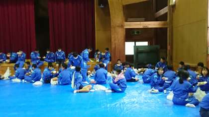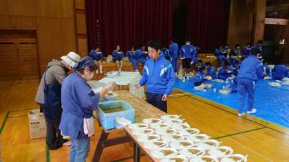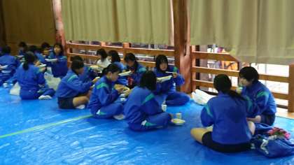 昼食タイムです。体育館でいただいています。