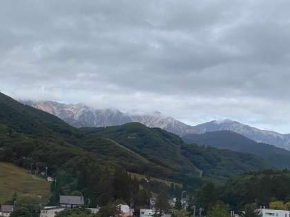 昨日の雨が雪になっていたのか、高い山並みが雪化粧しています。