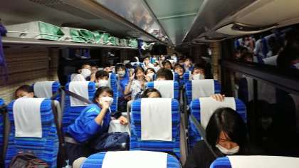 バス内は、こんな感じです。楽しくてしかたないようです。おおはしゃぎです。密接がやや・・・。マスクは、しっかりつけてます。おやつ中は、フェースシールド着用ですよ。