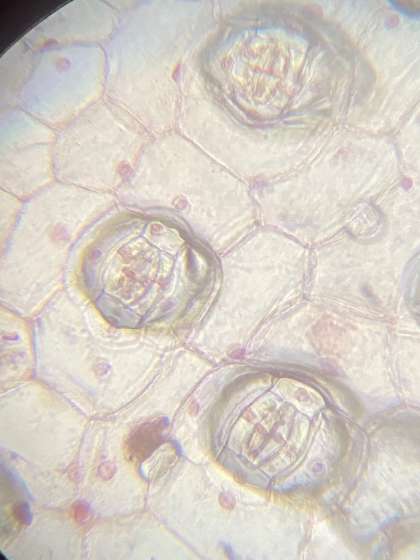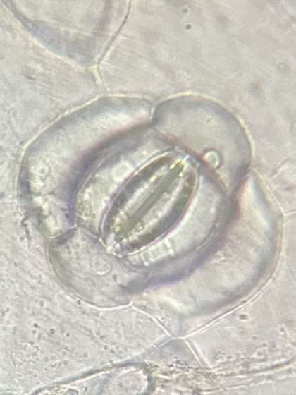 写真は露草の葉の裏の表皮の細胞です。気孔がよく見えています。