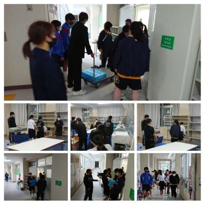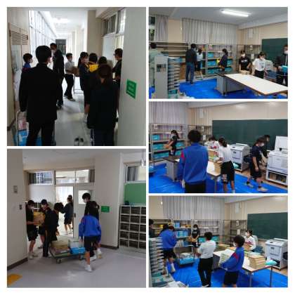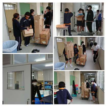教室等の設置工事のため、印刷室の移動作業を放課後に行いました。男子テニス部と女子バスケットボール部の部員が一生懸命に手伝ってくれました。先生方は大助かりでした。