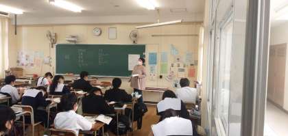 研究授業週間は相互授業参観でもあり、同じ教科の先生が授業に入り、他の先生の指導法も学びます。中部地方の勉強の中で質問に多くの生徒が答えていきます。