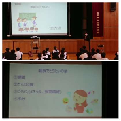「毎日を元気に過ごすために朝食は本当に大切なものです」「2・3年生の皆さんもしっかりと話を聞いて毎日を健康に過ごしましょう!」