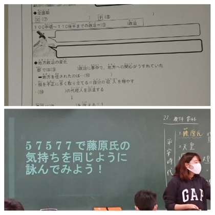 また、なかなか面白い宿題(藤原氏の気持ちを57577で表そう)が出され、授業の最後には振り返りとして確認テスト(小テスト)がありました。