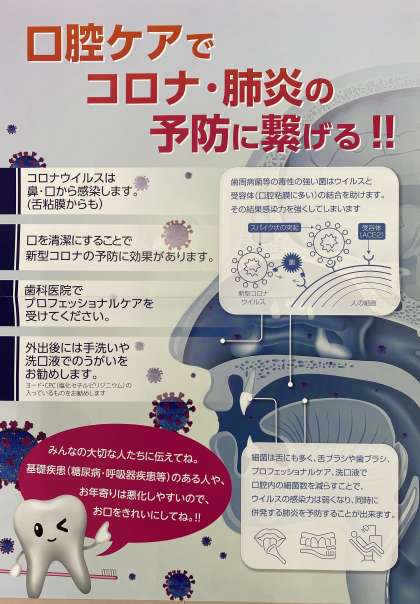 年生の歯と口の健康教室のなかで、歯科校医の谷口先生からコロナに関してのお話がありました。うがい、歯磨き、舌磨きなどで、口の中の細菌を減らすことにより、ウイルスの感染リスクを減らすことができる。また、それとと同時に肺炎の予防にもなるということでした。そして、大阪市学校歯科医会よりポスターをいただきましたので、保健室前に掲示しています。