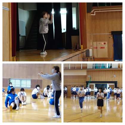 終盤は、何となくヒップホップダンスらしい動きになっていました。「これから4週間(週2回)のダンスの授業のはじまり〜はじまり〜」「1年生の皆さん、楽しみましょう!」