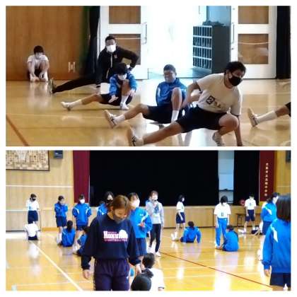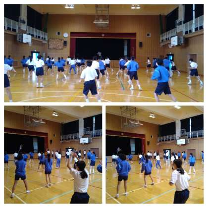 授業のはじめは、十分なストレッチとリズム体操的な動きでからだを温めてからダンスの基本的な動きを学びました。音楽をかけてながらの『体育』授業は、なかなか良いものです。