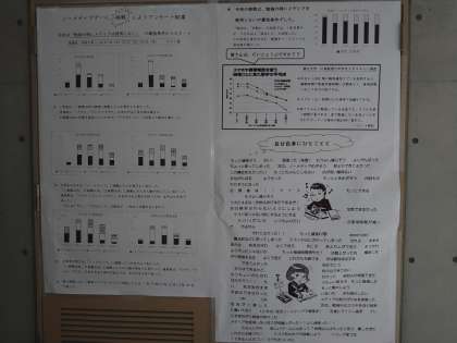 今回の挑戦は『テスト勉強中はメディアを使用しない』が最低条件でした。1年生は、90%以上が成功。どの学年も男子の方が成功率は高かったようです。写真は、保健室前の掲示物です。
