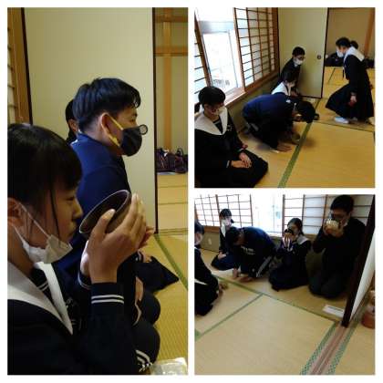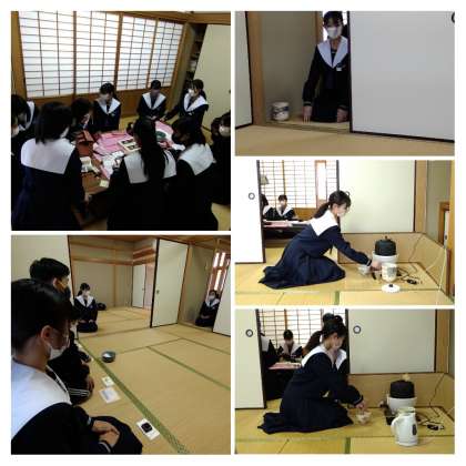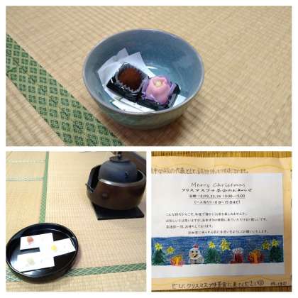 本日、和室で『クリスマスプチ茶会』は開かれました。静かな?雰囲気の中、一服のお茶に少し心が和んだような気がします。作法知らずの私に、2年生のNさんから厳しい指導がありました。「勉強しときます!」「恥ずかしっ」