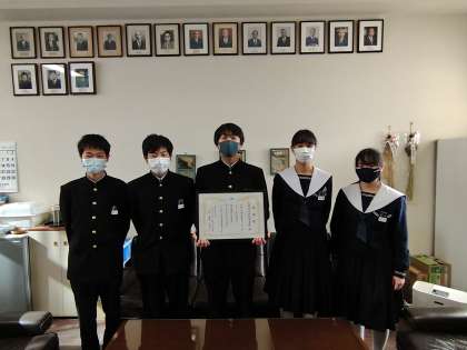 本日、校長室で生徒会役員に『感謝状』を授与しました。