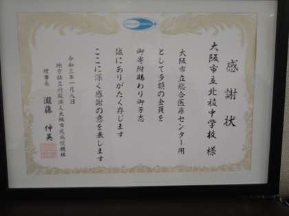 歳末助け合い募金活動の寄付に対して大阪市総合医療センターより『感謝状』が送られました。
