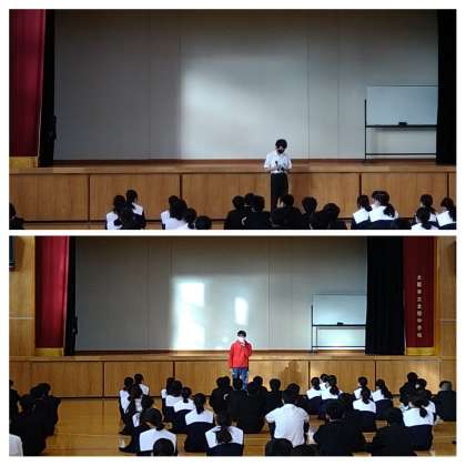 今朝は、1年生の学年朝礼がありました。担当の先生から2点お話がありました。