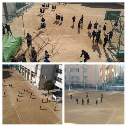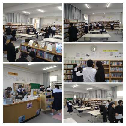 運動場では、多くの生徒が元気に動き回っています。図書室の『クイズ大会』は、盛況のようです。