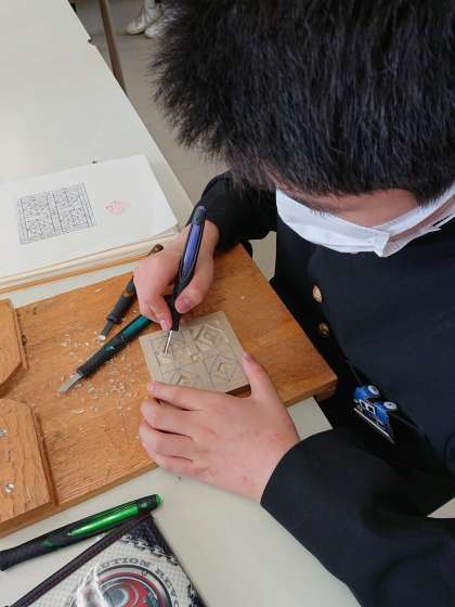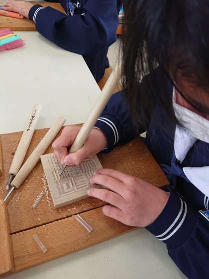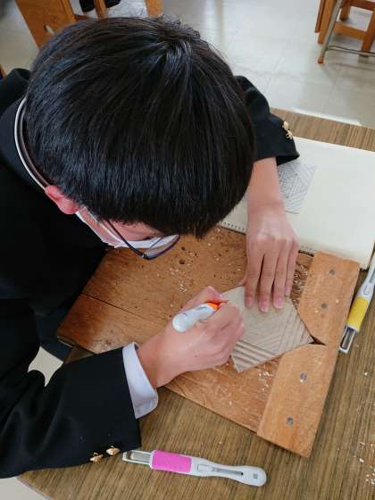 美術の授業の様子です。木彫(基礎彫り)での作品制作です。みんな集中して作業しています。コツさえつかめば意外ときれいにできるので、ハマる人もでてきました。