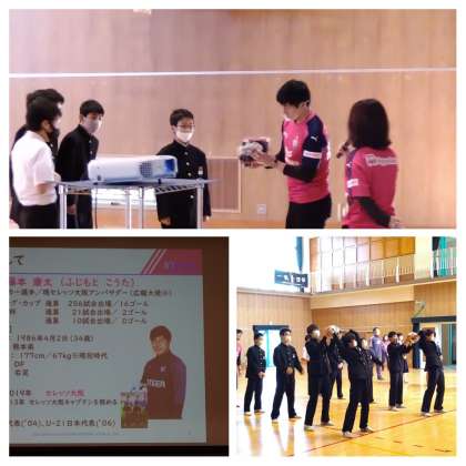 ・セレッソ(下の写真)⇒U−21日本代表にも選ばれ、セレッソ大阪のキャプテン経験のある藤本康太アンバサダーから直接お話を聴くことができました。お帰りの際、セレッソ大阪の大きな旗にサインをしてプレゼントしてくれました。「ありがとうございます!」