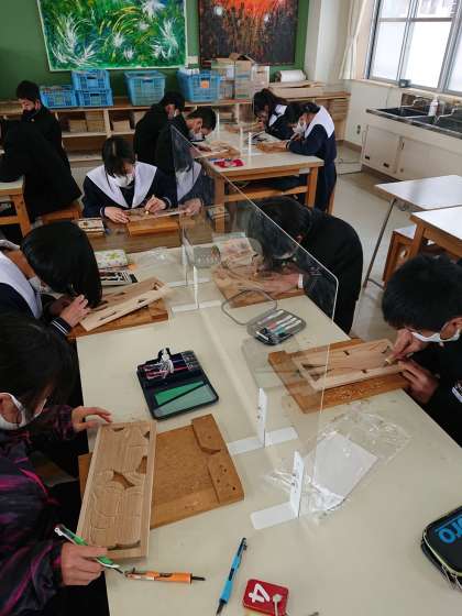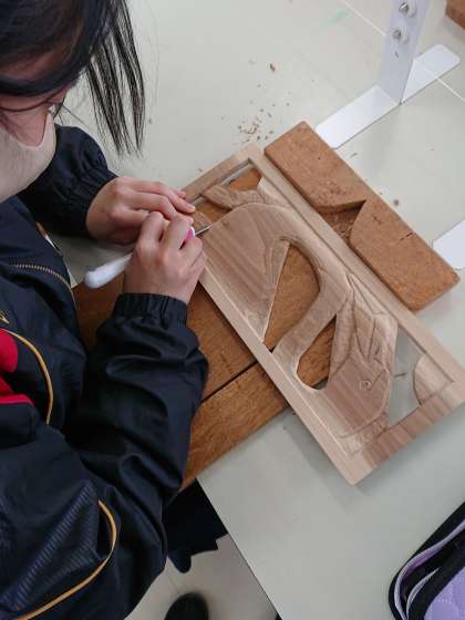 木彫レリーフ制作中。全員糸鋸盤で切り抜き終わり、全体的に浮きがって見えるよう、高低を良く考え彫っていきます。