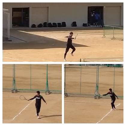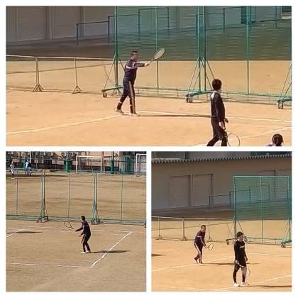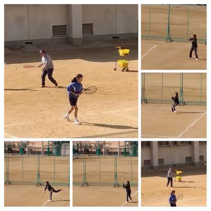 春っぽい日差しの中での女子テニス部の練習風景です。