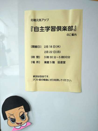 生徒会主催の『自習室』は、17日(水)と19日(金)に多目的室で実施されます(先生方からのアドバイスが受けられます)。