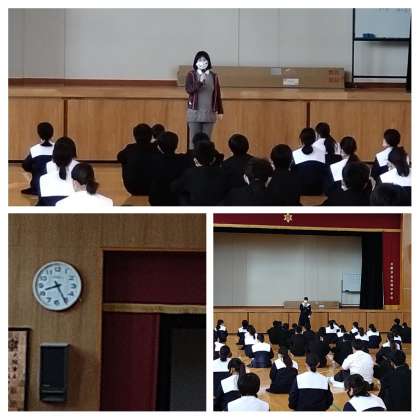 今朝は、1年生の学年朝礼がありました。担当の先生からは、「人は見た目が9割」ということについてのお話がありました。