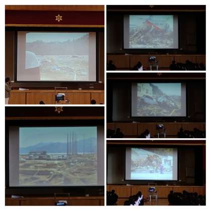 「私は、震災の1か月後に被災地へのボランティアに出発した」「写真を見ての通りの状態で、まるで戦後の焼け野原状態であった」「様々な思いが頭をめぐったが、最後に感じたことは、人と人のつながり、絆の大切さであった」