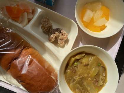 献立:カレーシチュー(近江牛)、フライドチキン、お祝いピクルス、フルーツゼリー