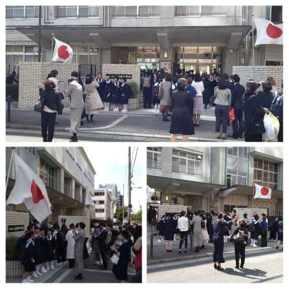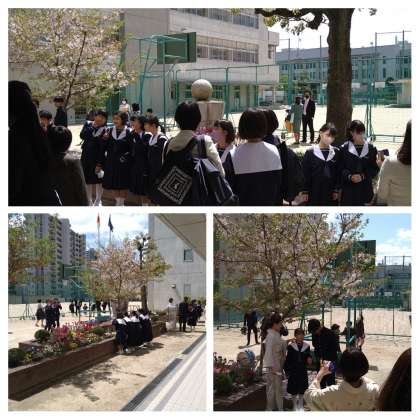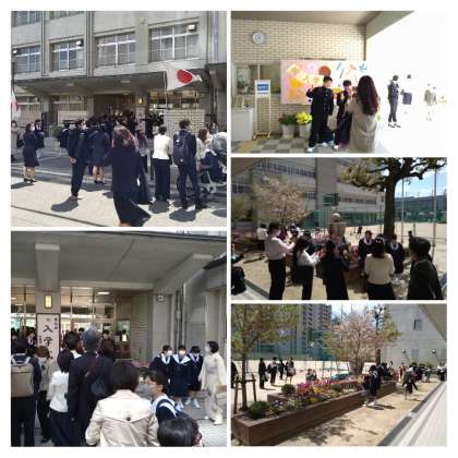 正門前や校庭で記念撮影です。