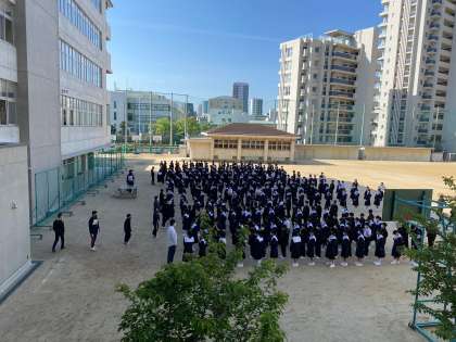 今後気温が上がることに鑑み、本日より全校朝礼の並び方が変わりました。影の範囲に整列します。