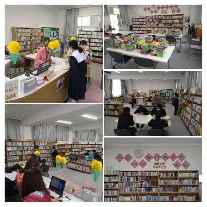 机の上には、各クラスの学級文庫に貸し出す本や辞書が準備されていました(右上の写真)。